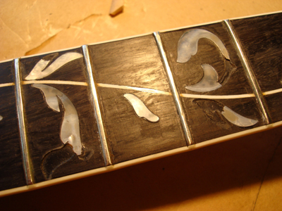 Here's an example of an instrument that was brought in for maintenance. Sanding the frets wasn't enough this time. The frets were worn out and we decided to replace them. When replacing the frets I always plane the fretboard to achieve a straight and clean base for the fretwork. The frets are profiled to create a good touch. The bridge and the saddle are checked out while I'm at it.