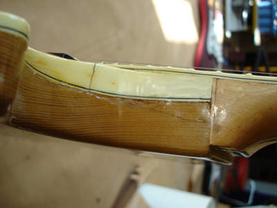 Happihyppelyn paikka oli myös, kun tutkailin soitinta. Uskomaton tärviö, ajattelin. Oliko sillä lapioitu ojaa, hakattu halkoja vai mitä. Kaula oli liimattu epoksilla jossain vaiheessa takaisin uskomattoman puusälän kera. Arvatenkaan mikään mitta tai kaulakulma mihinkään ilmansuuntaan ei ollut kohdallaan. Kaulan irroitus ja uuden kaulataskun rakentaminen oli työläs homma. Yhtä sun toista on tullut vastaan. Mutta hiljaa hyvä tulee… Se miten kyseinen laite on päätynyt Suomen kamaralle jäänee arvoitukseksi.