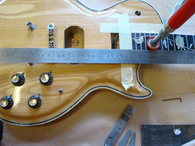 Tekevälle sattuu. Pieni lipsahdus ja lapanen lähti irti, eli kaula poikki. No, samalla sai mikit kyytiä. Käytiin sitten laite läpi. Lapaan pari jippoa, injektiolla liimaa ja jigiin puristukseen. Korjatun osion hionta, uusi maali ja lakka. Nauhatyöt. Satula kuosiin. Puhdistus ja kiillotus. Mikit vaihdettiin Seymour Duncanin 59 Vintage Blues settiin. Ja kyllä soi! Nyt on Les Paulilla kysyntää Torbjörnin studiolla.